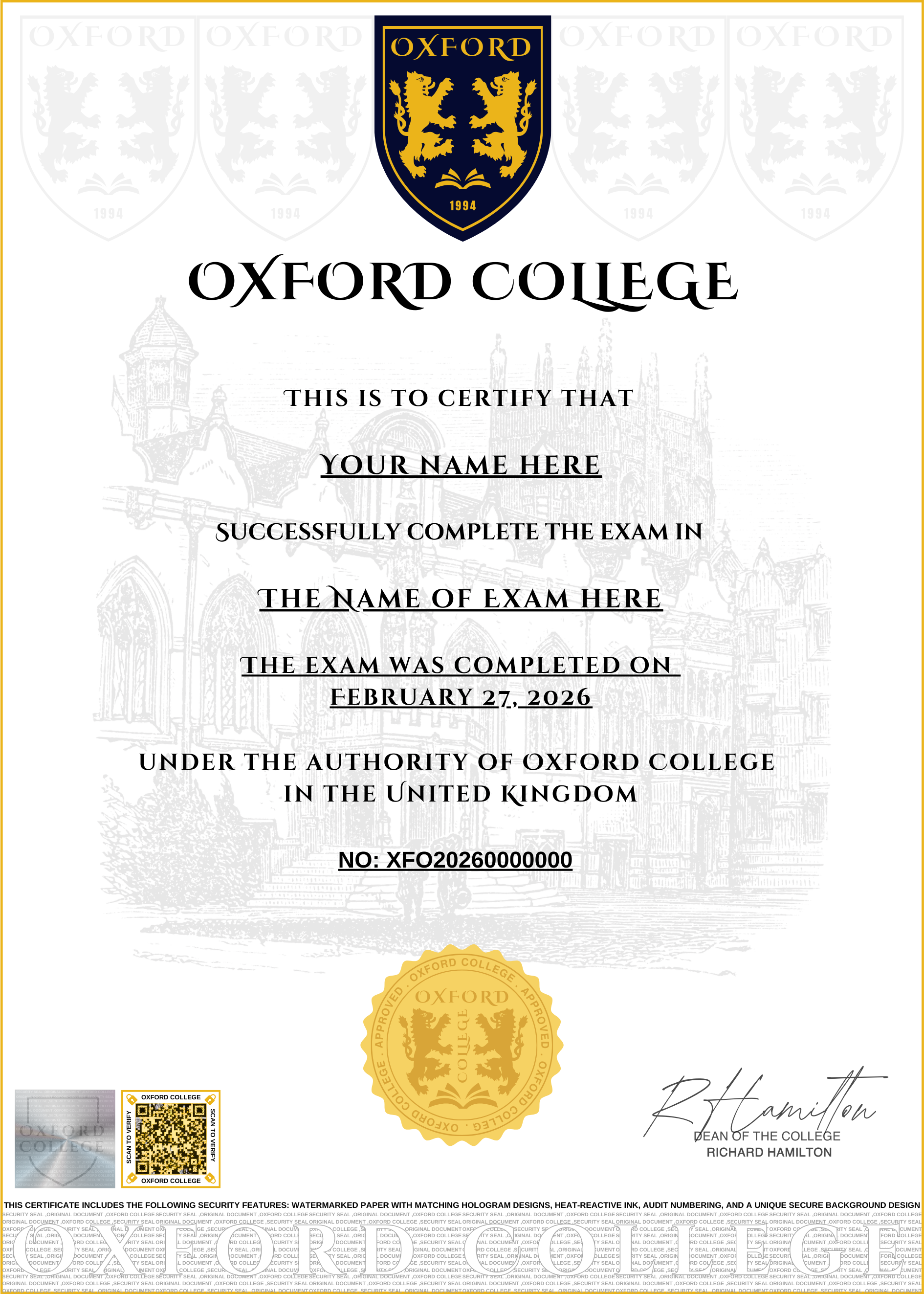 All certificates are officially issued by Oxford College, an independent educational institution established in 1994.